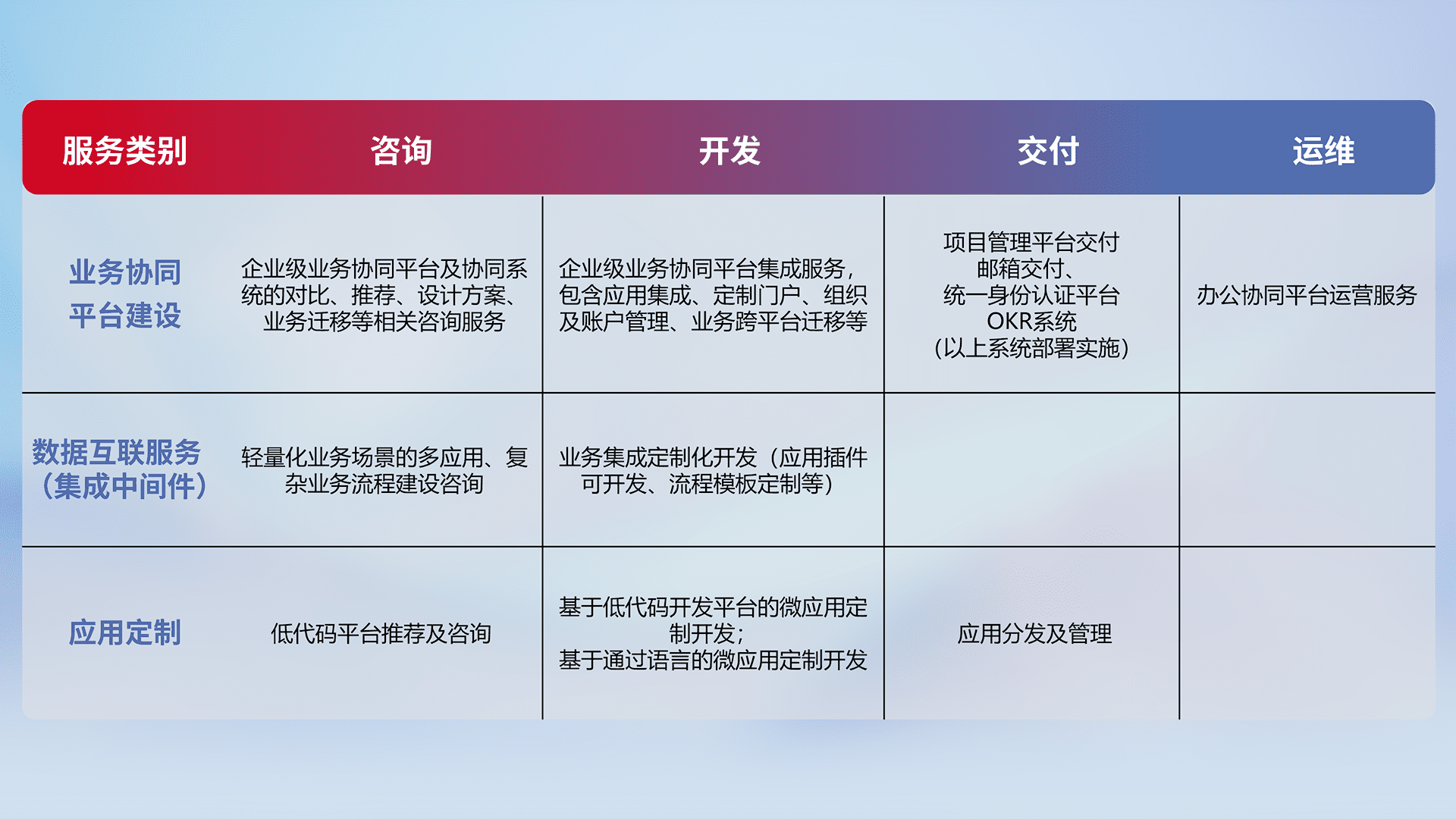 针对钉钉、、、企微、、、IDaas等平台级产品提供产品的规划、、、、方案、、、、交付、、定制化开发等服务,,实现如统一协同办公、、、智能客户服务、、、、混合会议管理、、、、智能数据查询、、等业务场景,,实现数字化转型。。。。