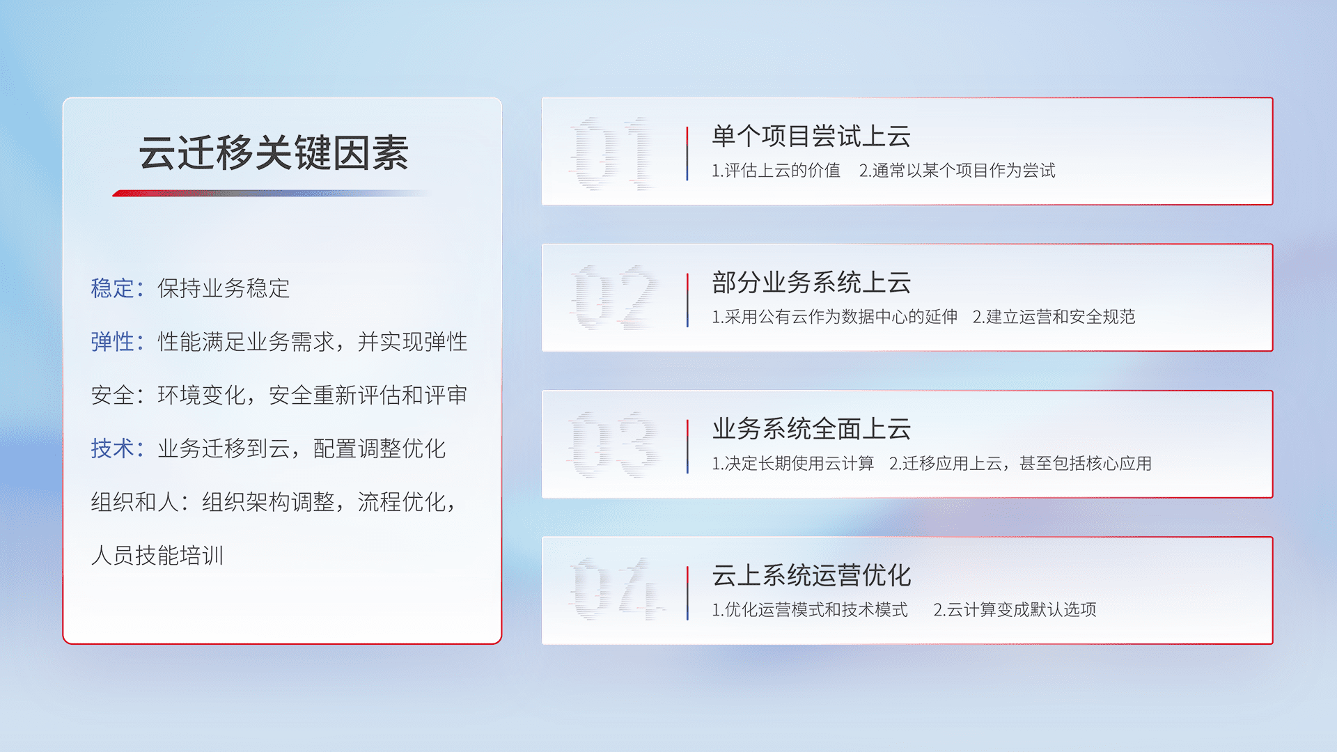 结合实际业务,,,,从规划设计、、云平台选型、、云原生改造、、数据迁移、、集成交付,,,迁移全过程为客户识别最佳上云路径,,,做好风险识别管理,,设计网络架构、、、、身份权限、、安全审计合规、、操作审计、、、、日志审计、、、监控告警策略、、、多站点容灾设计等,,对云上基础设施进行整体规划,,,,提升IT治理水平,,,以满足弹性、、高可用、、、、高性能的需求。。